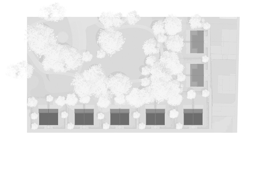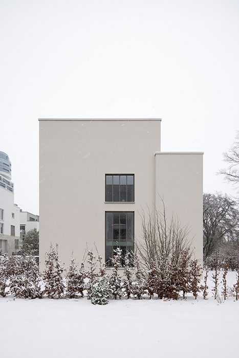 Die Wohnhäuser grenzen gartenseitig an den denkmalgeschützten Schubertschen Park im Stadtteil Sachsenhausen. Durch eine ruhige Baukörper- und Fassadengestaltung soll der Park mit seinem alten Baumbestand eine angemessene Säumung, ein Passepartout erhalten. Die Setzung der Volumen erlaubt einen räumlich tiefengestaffelten Übergang zu den angrenzenden Wohnquartieren. Der seitliche Abstand zu den Nachbarhäusern schafft über die giebelseitigen Galeriefenster einen großzügigen Bezug zum Außenraum. Der Fassadenversatz auf der Giebelseite gliedert den Baukörper in ein drei- und ein viergeschossiges Bauteil. Es entsteht eine insgesamt vertikale Gebäudepropotion. Die Gebäude variieren in nuancierten Farbabstufungen und variierter Detailausführung. 4.800 m² Bgf