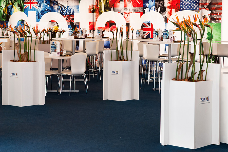 Temporäre Innenraumgestaltung für Lounges und Hospitality Bereiche in den Stadien und auf den Außengeländen für die Dauer der Weltmeisterschaft. Die Planung umfasst die Anordnung der temporären Zeltstädte, Umnutzung der Stadionlounges, Eventsignage und Interiors für verschiedene Gästekategorien. Anforderungen der Logistik, Sicherheit, Orientierung, Flexibilität und Modularität bestimmen maßgeblich die Entwürfe. Es wurde eine modulare Kollektion von Möbelelementen aus recyclingfähigem Leichtbaumaterial entwickelt. 16.000 m² Bgf, 10 Spielorte