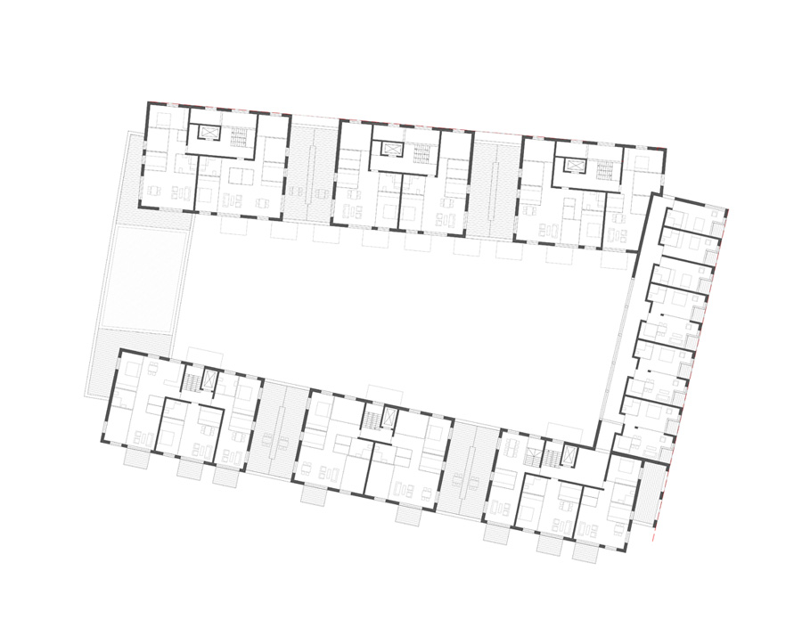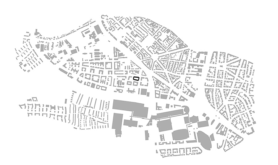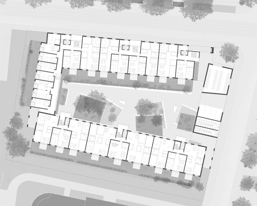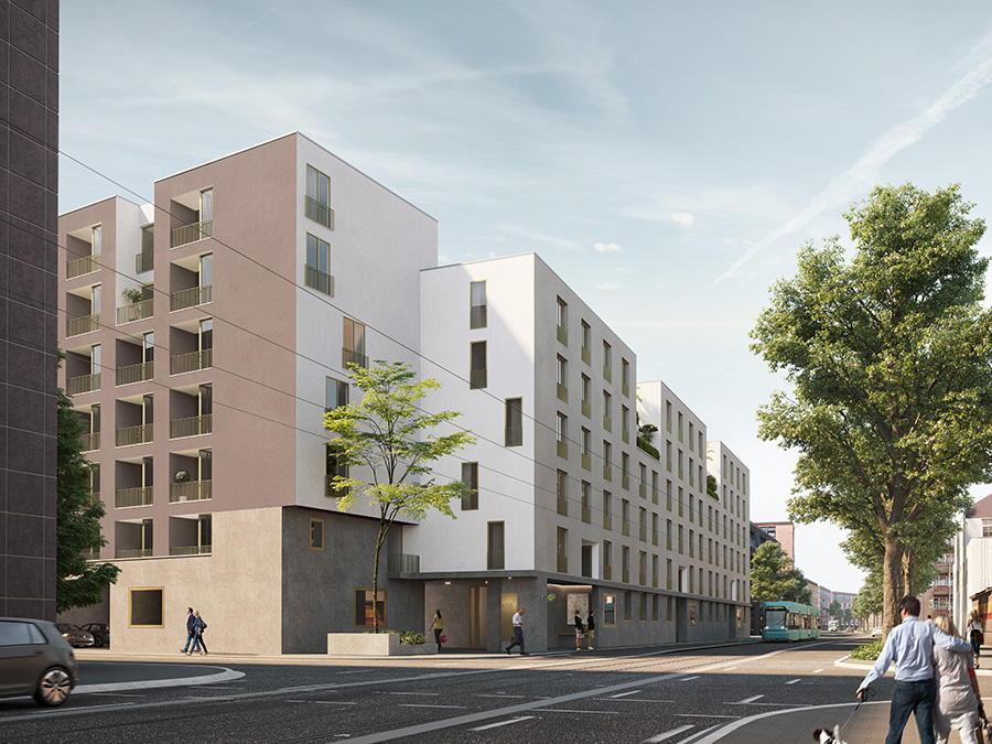 Das städtebaulich heterogene Umfeld ist geprägt von verschiedenen Formen zergliederter Blockrandbebauungen. Der Entwurf schlägt eine Typologie vor, die als gefügter Blockrand beschrieben werden kann. So vermittelt die Bebauung zwischen den angrenzenden gründerzeitlichen Blockrandbebauungen und den andererseits großteiligen offenen Blockstrukturen. Die vier Flanken des Blocks werden individuell entwickelt als Antwort auf die jeweils sehr unterschiedlichen stadträumlichen Gegebenheiten. Es entstehen vier Gebäudeteile mit variierender Traufhöhe, Silhouette, Fassadenrhythmus. Die Fügung der Gebäudeteile erfolgt als Collage. Durch die Verschneidungen an den Blockkanten entstehen signifikante Innenecken, die das Gebäude mit dem Straßenraum verknüpfen. Die dergestalte Ausformulierung der Gebäudeecke findet sich vielerorts in Gebäuden des Neuen Bauen Frankfurts. Der collagierte Block versucht die ruhende Ordnung der klassischen Blockrandbebauung mit der Dynamik des Stadtteils und seiner spezifischen Aussenräume zu verbinden. 18.000 m² Bgf, 185 Wohneinheiten