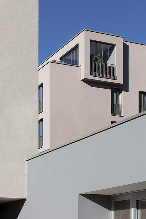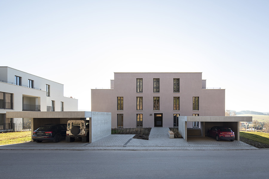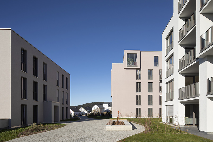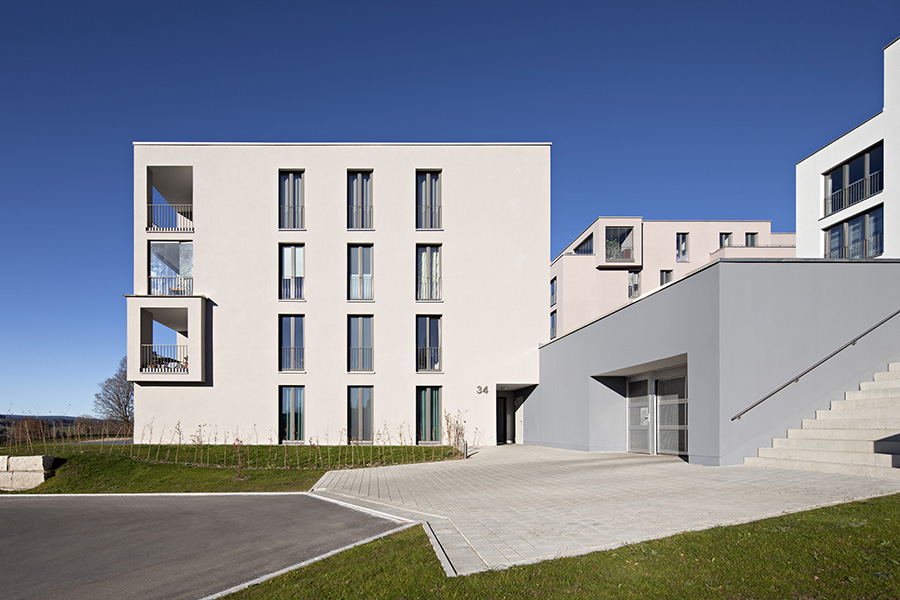 Als Auftakt von mehreren Bauabschnitten für das Wohnquartier "Schönblick" in Sankt Georgen im Schwarzwald gruppieren sich die ersten 3 Bauten entlang eines Waldrandes. Im Hang gelegen bilden die Körper durch ihre Stellung eine gemeinsame Mitte auf einem Geländeplateau aus. Von dort aus werden landschaftliche Raumbezüge inszeniert und in die plastische Gestaltung der Kuben überführt. Loggien und Terrassen rahmen unterschiedlichste Talblicke für ihre jeweiligen Bewohner. Die Fassaden führen in Silhouette, Relief und Farbklang den Dialog der Architektur mit der ländlichen Umgebung fort. 6.500 m² Bgf, 36 Wohnungen