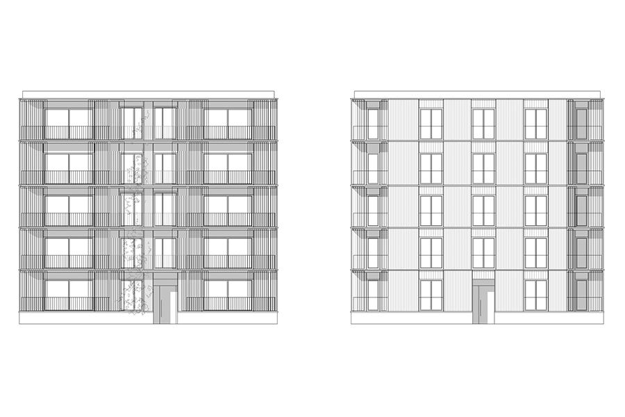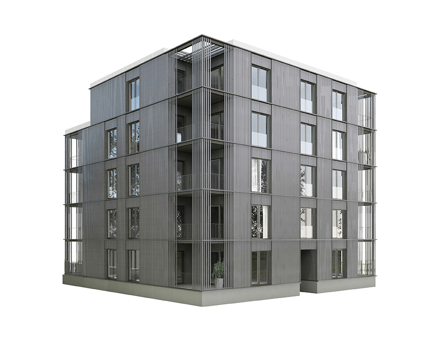 An der Promenade am Rand des geplanten BUGA Geländes entstehen zwei Wohnhäuser. Sie sind Teil eines Modellquartiers auf der Fläche der ehemaligen Spinelli Barracks. Die Häuser haben eine kompakte Kubatur und fügen sich in offener Bauweise in die Hauszeile an der Promenade ein. Die architektonische Erscheinung soll Verschiedenheit und Verwandschaft der beiden benachbarten Bauten zum Ausdruck bringen. Die Fügung der Loggienräume an den Hauptbaukörper, Rastermaße in der Holzverschalung, Material- und Farbwahl erzeugen die Verschiedenheit. Sockel, Dachabschluss und grundsätzliche Proportionsverhältnisse in der Fassade sind zueinander verwandt. Die hybride Bauweise ist Ergebnis eines intensiv geführten Planungsprozesses mit allen beteiligten Disziplinen. Die Mischkonstruktion aus Holz, Beton und Ausbauteilen wurde hinsichtlich Co2 Bilanz und Ökonomie genau austariert. 4.600 m² Bgf, 28 Wohneinheiten Wettbewerb 1.Preis, Baubeginn 2023