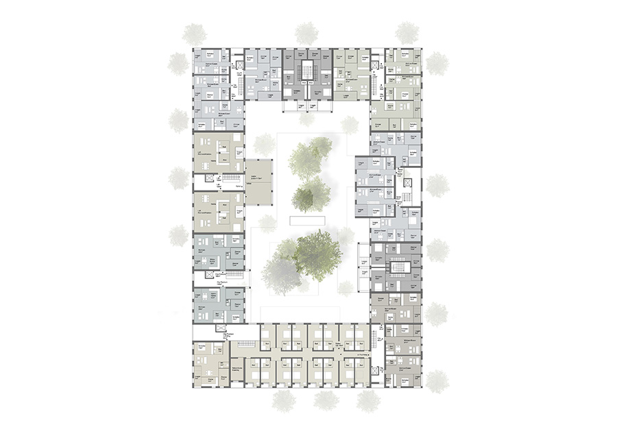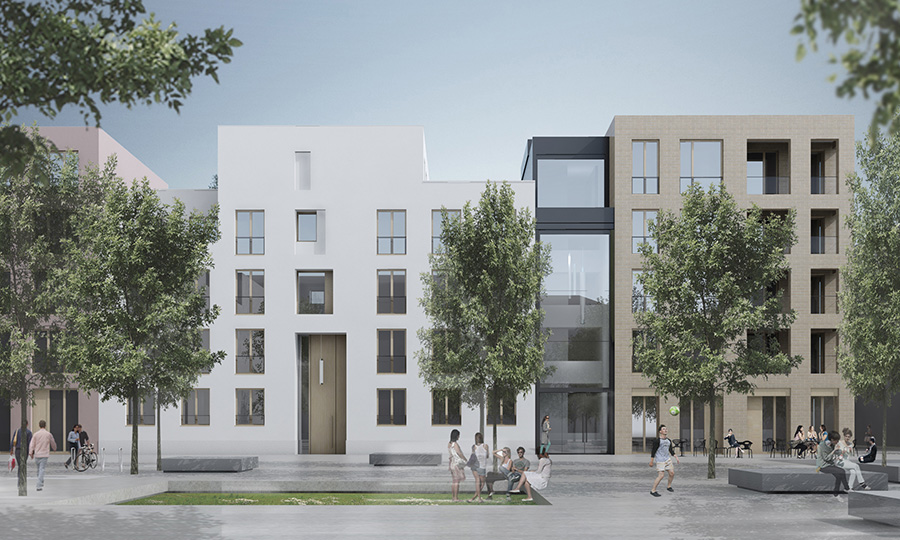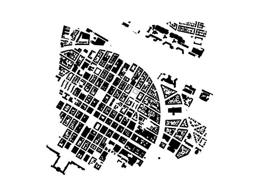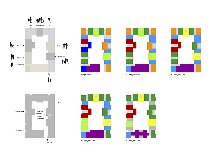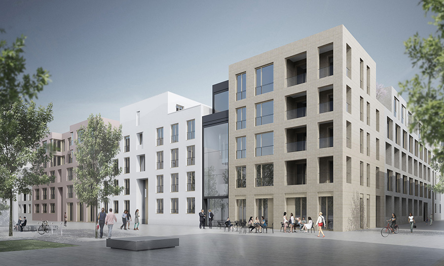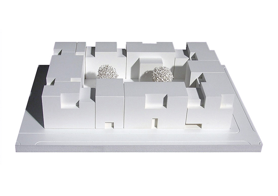 Die Gestaltung eines vollständigen städtischen Blocks im Rahmen einer singulären Baumaßnahme stellt eine besondere konzeptionelle Herausforderung dar. Diese besteht darin, das historisch gewachsene Leitbild der Stadt im Sinne einer komplexen Collage aus baulichen Strukturen, Nutzungen, Stilen und materieller Alterung fortzuschreiben. Dabei bilden die überlieferten städtebaulichen Regeln (Parzellierung, Traufhöhen, Baulinien etc) nur den äußeren Rahmen für eine Neuinterpretation dieser Aufgabe, die durch schlichte Simulation des Bestehenden nicht glaubhaft zu lösen wäre. Der Block setzt sich aus einigen wenigen Gebäudetypen so zusammen, daß Hausabschnitte erkennbar sind. Es ergibt sich ein Grundrhythmus, der die Anlage in das städtische Umfeld einfügt und ein gutes Maß an Kleinteiligkeit aufweist. Der obere Abschluss der Bauten variiert im Bereich des 3. bis 5. Geschosses in der Weise, dass eine lebhafte Silhouette entsteht und die spezifische Physiognomie einzelner Bauwerke erkennbar wird. 18.000 m² Bgf, Wohnen und Gewerbe Wettbewerb