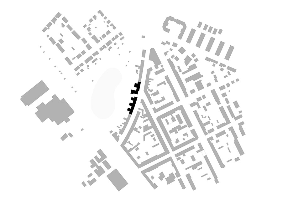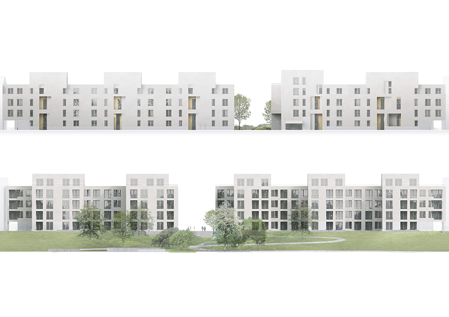Die Fortführung der bestehenden Blockrandbebauung wird als ein Setzen von städtischen ´Häusern´ interpretiert, die als einzelne Adressen lesbar sind und die Baumasse entlang des Straßenverlaufs in maßstäbliche Segmente gliedern. Die Bauten bilden durch plastisch prägnante Eingangsbereiche und mittig aufstrebende Fassaden einen Rhythmus, der in der oberen Gebäude-Kontur durch die Staffelungen im vorletzten und letzten Geschoss ausformuliert wird. Die beiden thematischen Abschnitte ´Wohnen´ und ´Betreutes Wohnen´ sind dabei so gesetzt, dass der Durchgang zum rückwärtigen Park als Platzbereich aufgeweitet werden kann. Zum Park sind Wohnhöfe ausgebildet, die in ihrer kleinmaßstäblichen Ausprägung auch geschützte, halbprivate Außenräume mit entsprechenden Gartenanteilen ermöglichen. 11.000 m² Bgf, 86 Wohneinheiten