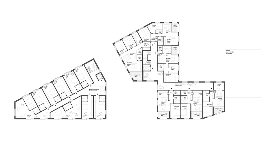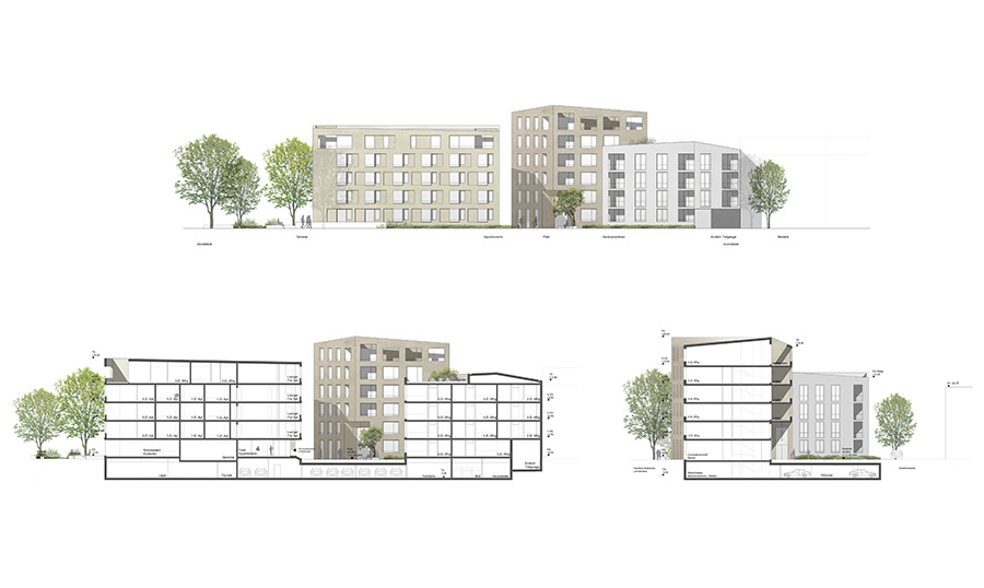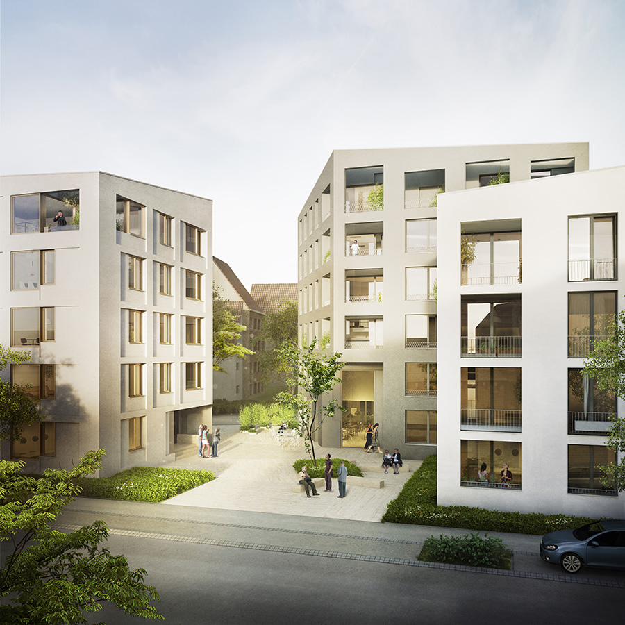 Das Projekt gliedert sich in ein heterogenes Umfeld ein, dass von dörflicher Kleinteiligkeit bis hin zu weitläufigen Verkehrsräumen und baulichen Großstrukturen durch Diskrepanzen im Maßstab gekennzeichnet ist. Es wird eine Komposition aus drei Kubaturen realisiert, die jeweils einzeln aber auch als Ensemble lesbar sind und somit elastisch auf die umliegenden Situationen reagieren. Die 3 Häuser rahmen dabei eine Durchwegung des Grundstücks, die in einen kleinen Platzbereich mündet. Dieser Ort ist gedanklich den oft kompakten Außenräumen einer gewachsenen dörflichen Struktur nachempfunden. Die Häuser sind in Grundfläche und Höhe so variiert, dass ein spannungsreiches Ensemble entsteht, dessen Bestandteile sich in wechselnden Perspektiven räumlich verschieben und überdecken. Die Häuser werden in Material, Textur und Farbe differenziert, wobei der Zusammenhalt einer durchgängigen Gestaltung gewahrt bleiben soll. 4.500 m² Bgf, Wohnen, Boardinghouse und Gewerbe Wettbewerb 1.Preis