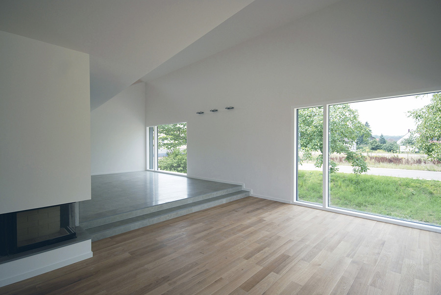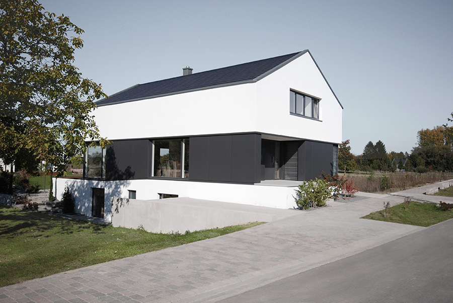 Wohnhaus für eine Person. Die geringe Größe des Hauses und die Kleinteiligkeit der umgebenden Siedlung führen zu einem Entwurf typologischer Eindeutigkeit. Das Haus fügt sich aus massivem Sockel, offenem Plan im Erdgeschoss und privat umschlossenem Raum im Obergeschoss. Die Ausbildung des Sockels ergibt sich in einem hochwassergefährdeten Gebiet aus dem Baurecht. Die Teilflächen des in der Außenerscheinung typischen Giebeldachs entfalten sich im Innern zu raumbildenden Polygonalflächen. 380 m² Bgf