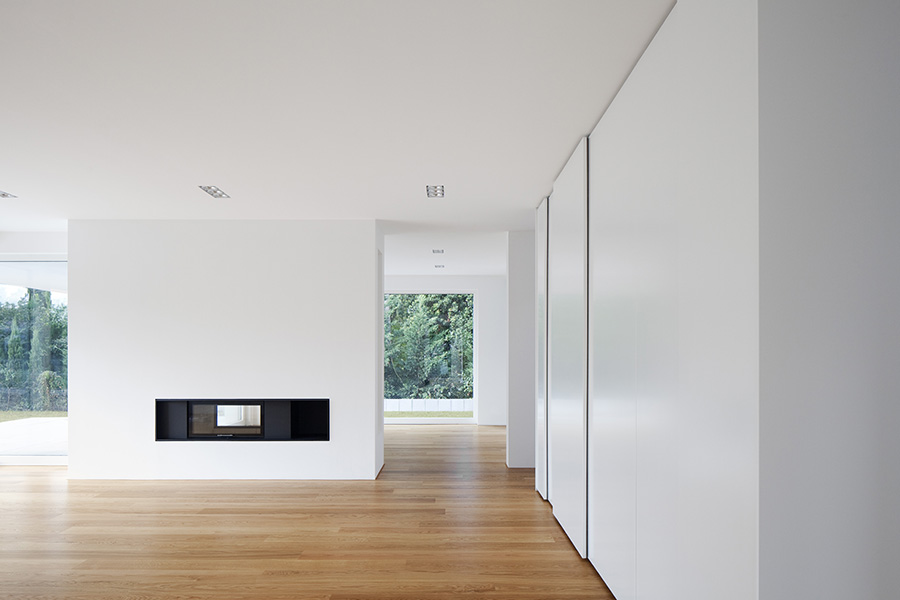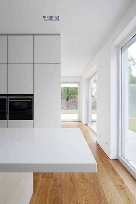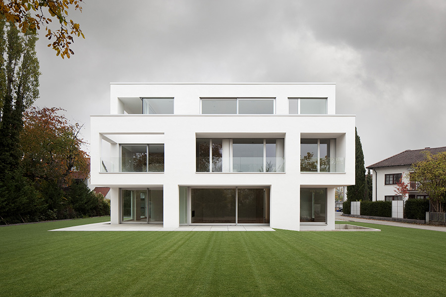 In einer Wohngegend mit homogener Bebauungsstruktur gelegen, konzentriert sich der Baukörper in Geometrie und Material auf sich selbst. Die Staffelung der Baumassen ereignet sich um die zentrale Eingangshalle. Die horizontale Verschiebung der Geschosse generiert den Wohnbereichen entsprechend Terrassen und Überdachungen. Dabei entsteht eine dem Ort und der Bestandsbebauung angemessene Gebäudesilhouette. Die großzügige horizontale Linienführung im Massivbau und eine detaillierte Ausbildung der Öffnungsbauteile erzeugen den eleganten und wertigen Ausdruck des Wohnhauses. 600 m² Bgf