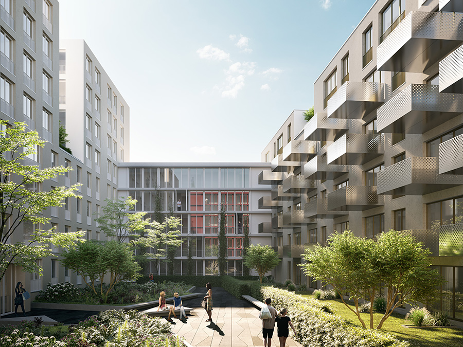 Das städtebaulich heterogene Umfeld ist geprägt von verschiedenen Formen zergliederter Blockrandbebauungen. Der Entwurf schlägt eine Typologie vor, die als gefügter Blockrand beschrieben werden kann. So vermittelt die Bebauung zwischen den angrenzenden gründerzeitlichen Blockrandbebauungen und den andererseits großteiligen offenen Blockstrukturen. Die vier Flanken des Blocks werden individuell entwickelt als Antwort auf die jeweils sehr unterschiedlichen stadträumlichen Gegebenheiten. Es entstehen vier Gebäudeteile mit variierender Traufhöhe, Silhouette, Fassadenrhythmus. Die Fügung der Gebäudeteile erfolgt als Collage. Durch die Verschneidungen an den Blockkanten entstehen signifikante Innenecken, die das Gebäude mit dem Straßenraum verknüpfen. Die dergestalte Ausformulierung der Gebäudeecke findet sich vielerorts in Gebäuden des Neuen Bauen Frankfurts. Der collagierte Block versucht die ruhende Ordnung der klassischen Blockrandbebauung mit der Dynamik des Stadtteils und seiner spezifischen Aussenräume zu verbinden. 18.000 m² Bgf, 185 Wohneinheiten