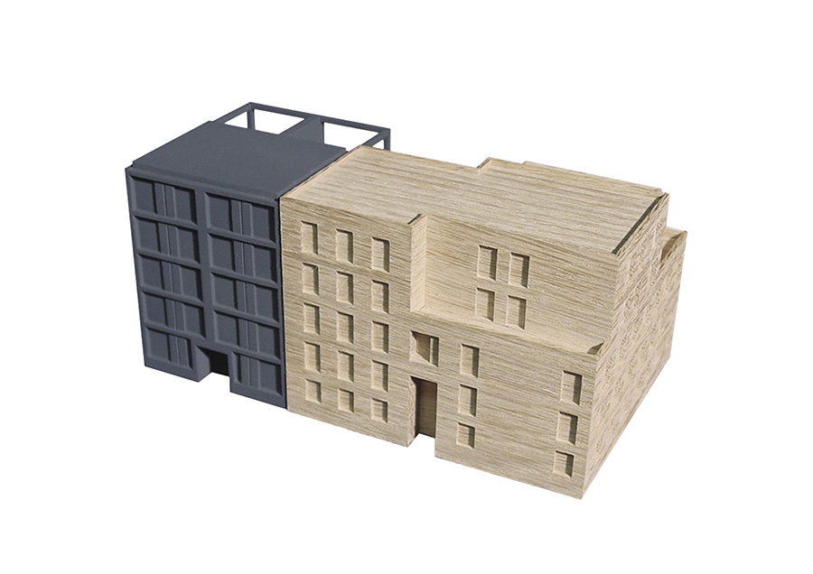 Die Gestaltung eines vollständigen städtischen Blocks im Rahmen einer singulären Baumaßnahme stellt eine besondere konzeptionelle Herausforderung dar. Diese besteht darin, das historisch gewachsene Leitbild der Stadt im Sinne einer komplexen Collage aus baulichen Strukturen, Nutzungen, Stilen und materieller Alterung fortzuschreiben. Dabei bilden die überlieferten städtebaulichen Regeln (Parzellierung, Traufhöhen, Baulinien etc) nur den äußeren Rahmen für eine Neuinterpretation dieser Aufgabe, die durch schlichte Simulation des Bestehenden nicht glaubhaft zu lösen wäre. Der Block setzt sich aus einigen wenigen Gebäudetypen so zusammen, daß Hausabschnitte erkennbar sind. Es ergibt sich ein Grundrhythmus, der die Anlage in das städtische Umfeld einfügt und ein gutes Maß an Kleinteiligkeit aufweist. Der obere Abschluss der Bauten variiert im Bereich des 3. bis 5. Geschosses in der Weise, dass eine lebhafte Silhouette entsteht und die spezifische Physiognomie einzelner Bauwerke erkennbar wird. 18.000 m² Bgf, Wohnen und Gewerbe Wettbewerb
